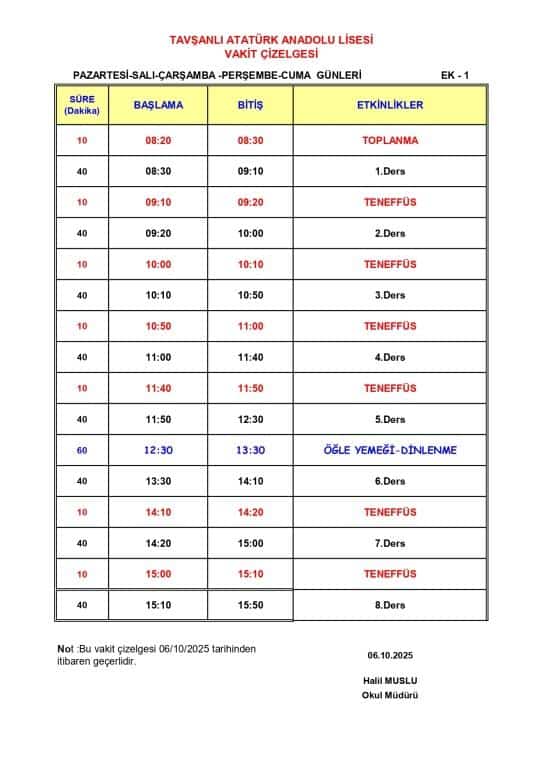 Okulumuza ait 2025-2026 Eğitim ve Öğretim Yılı Vakit çizelgesi sunulmuştur.
